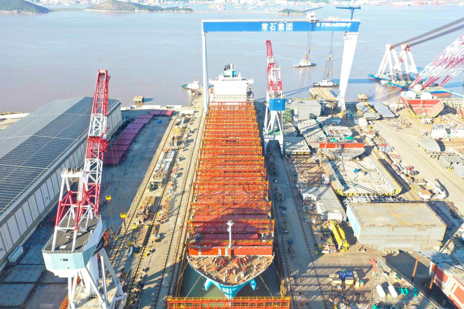 TSUNEISHI SHIPBUILDING Co., Ltd. (Head Office: Fukuyama, Hiroshima, Japan) is pleased to announce that TSUNEISHI GROUP (ZHOUSHAN) SHIPBUILDING INC. (hereinafter “TZS”), its manufacturing base in China, successfully launched the Methanol Dual-Fuelled 5,900TEU Type Container Carrier on 27 August 2025. This vessel will be delivered on February 2026.